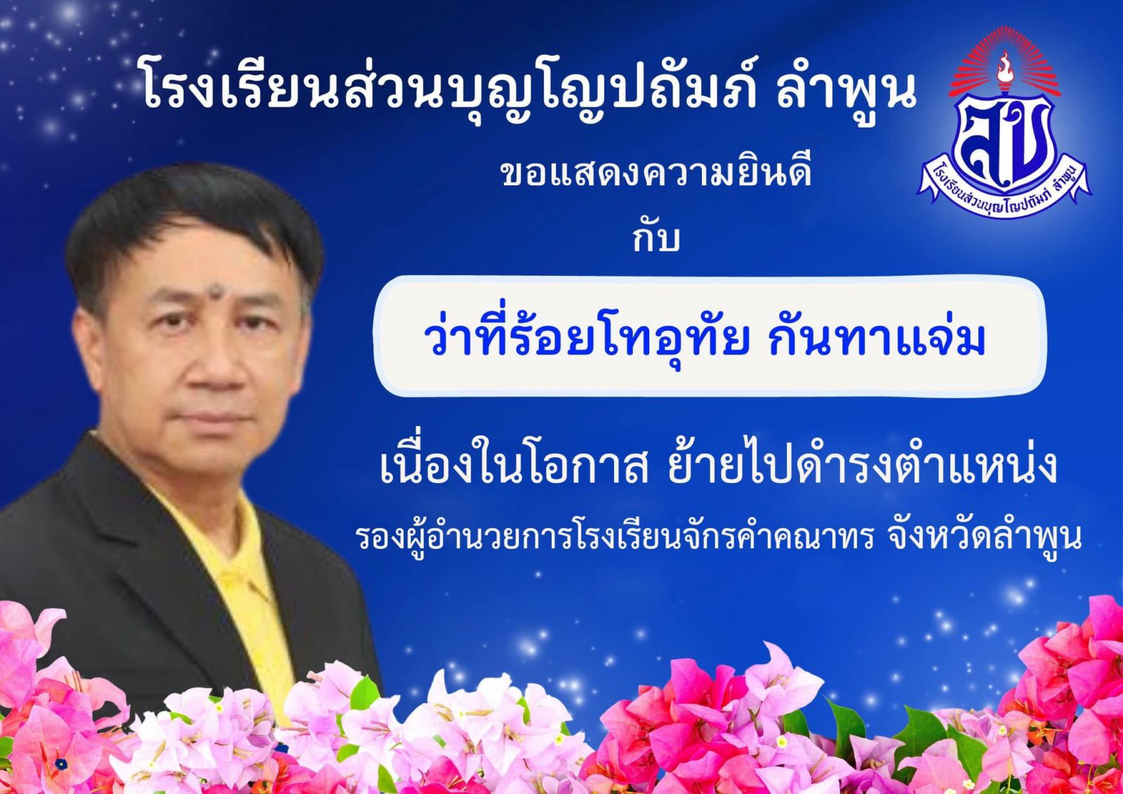 ขอแสดงความยินดีกับ ว่าที่ร้อยโทอุทัย กันทาแจ่ม เนื่องในโอกาสย้ายไปดำรงตำแหน่ง รองผู้อำนวยการ โรงเรียนจักรคำคณาทร จังหวัดลำพูน