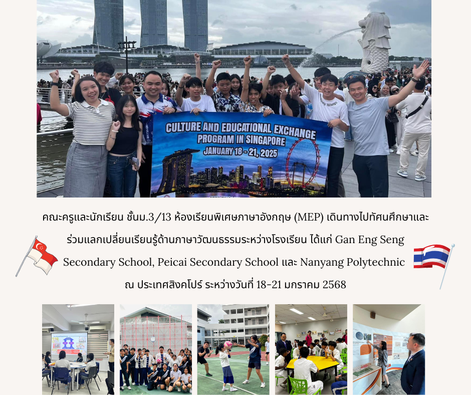 คณะครูและนักเรียน ชั้นม.3/13 ห้องเรียนพิเศษภาษาอังกฤษ (MEP) แลกเปลี่ยนเรียนรู้ด้านภาษาวัฒนธรรมระหว่างโรงเรียน ณ ประเทศสิงคโปร์ ระหว่างวันที่ 18-21 มกราคม 2568