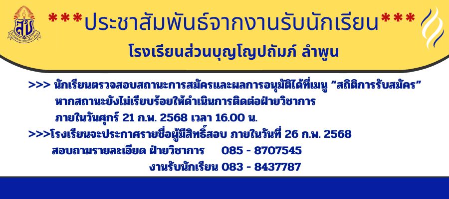 ประชาสัมพันธ์จากงานรับนักเรียน โรงเรียนส่วนบุญโญปถัมภ์ ลำพูน