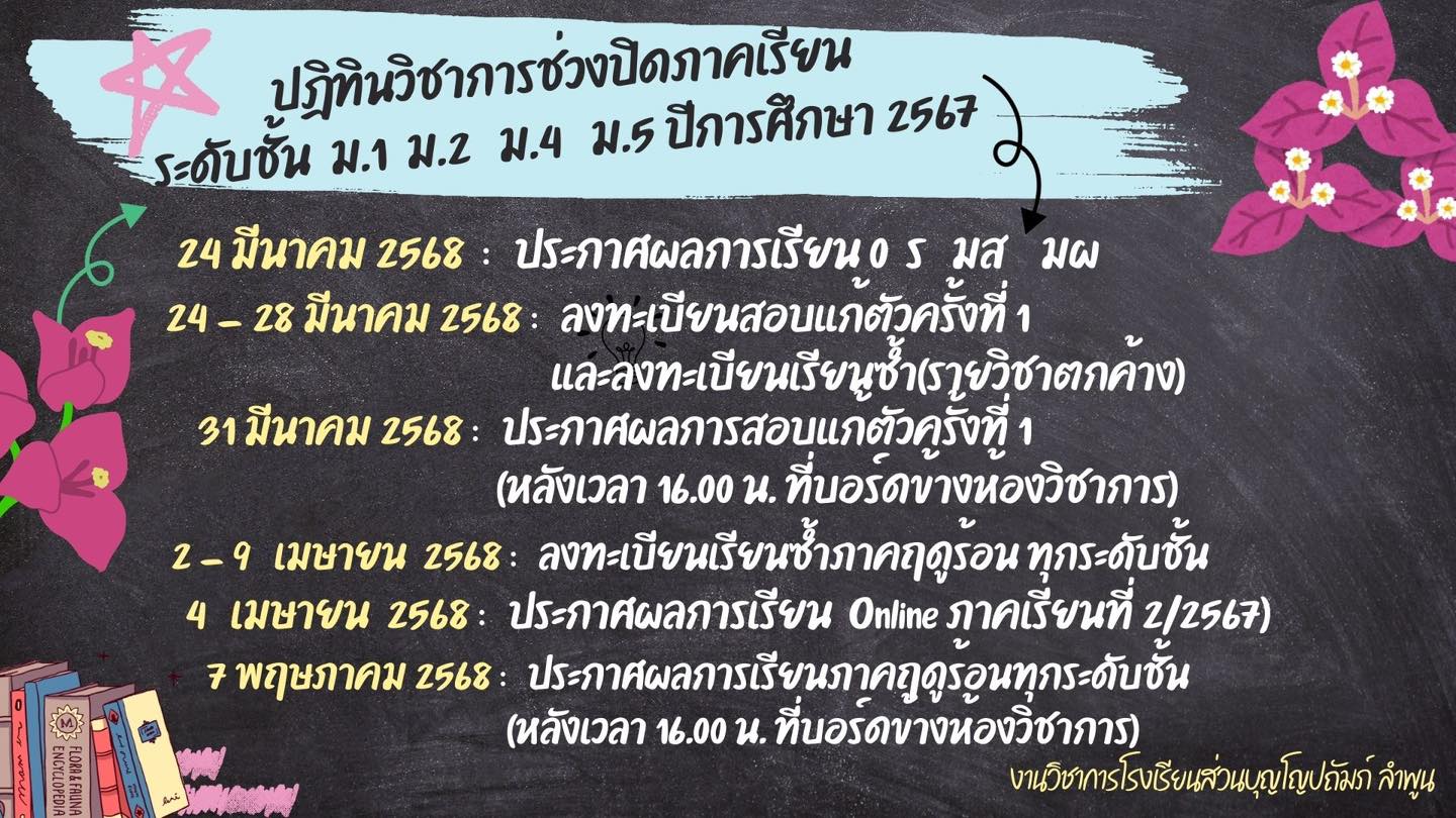 แจ้งปฏิทินของนักเรียนช่วงปิดภาคเรียน นักเรียนสามารถมาติดต่อโรงเรียนตามวันเวลาดังกล่าว