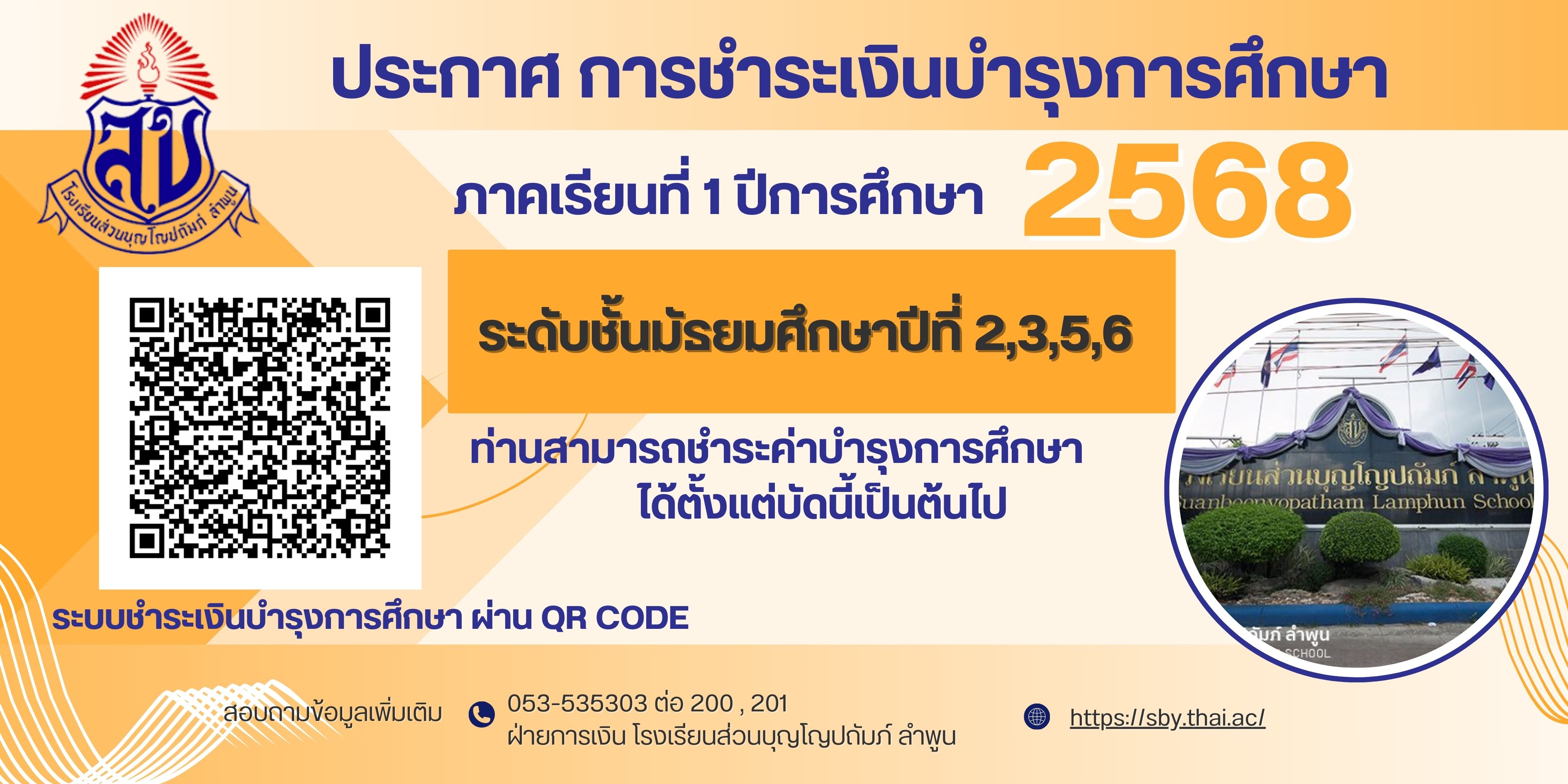 ขณะนี้ระบบชำระค่าบำรุงการศึกษาภาคเรียนที่ 1 ปีการศึกษา 2568 ได้พร้อมให้บริการผู้ปกครองทุกท่านแล้ว ท่านสามารถชำระค่าบำรุงการศึกษา ได้ตั้งแต่บัดนี้เป็นต้นไป ตามลิงค์ด้านล่าง