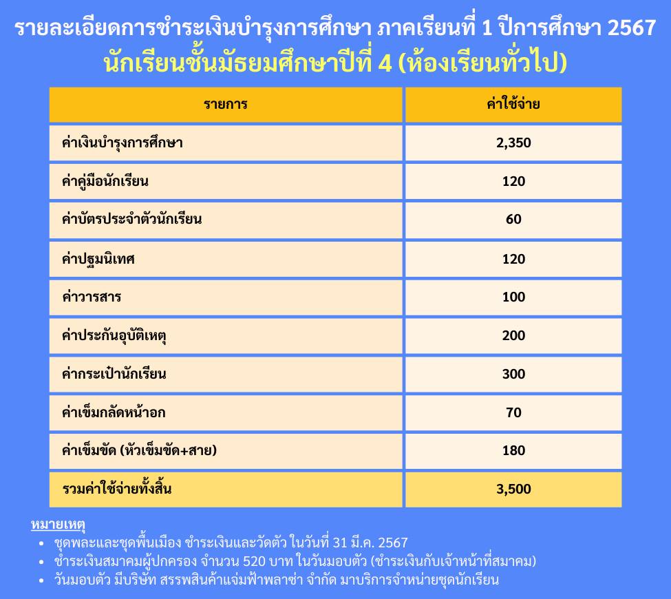 รายละเอียดการชำระเงินบำรุงการศึกษา ม.4 (ห้องเรียนทั่วไป) ภาคเรียนที่ 1 ปีการศึกษา 2567