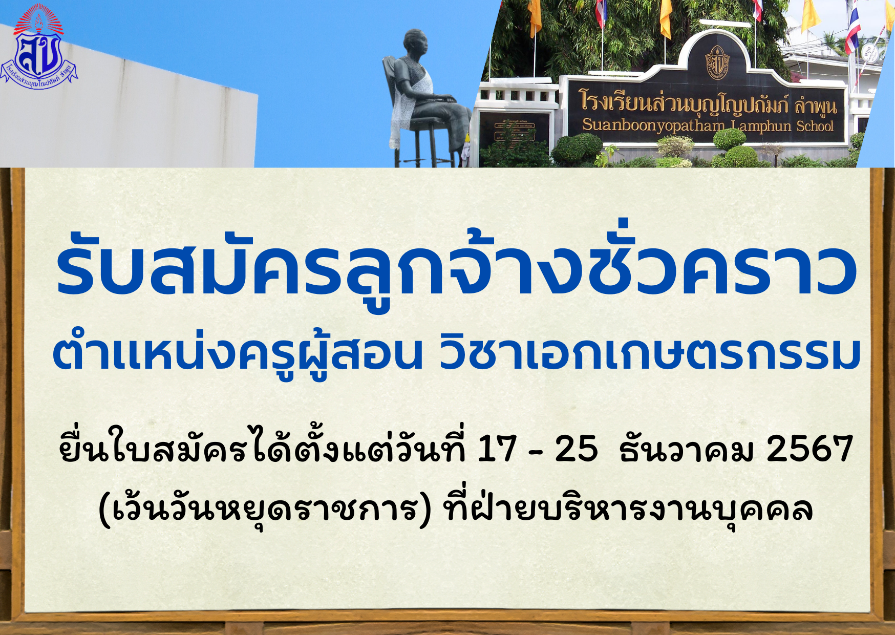 ประกาศรับสมัครลูกจ้างชั่วคราว ตำแหน่งครูผู้สอน