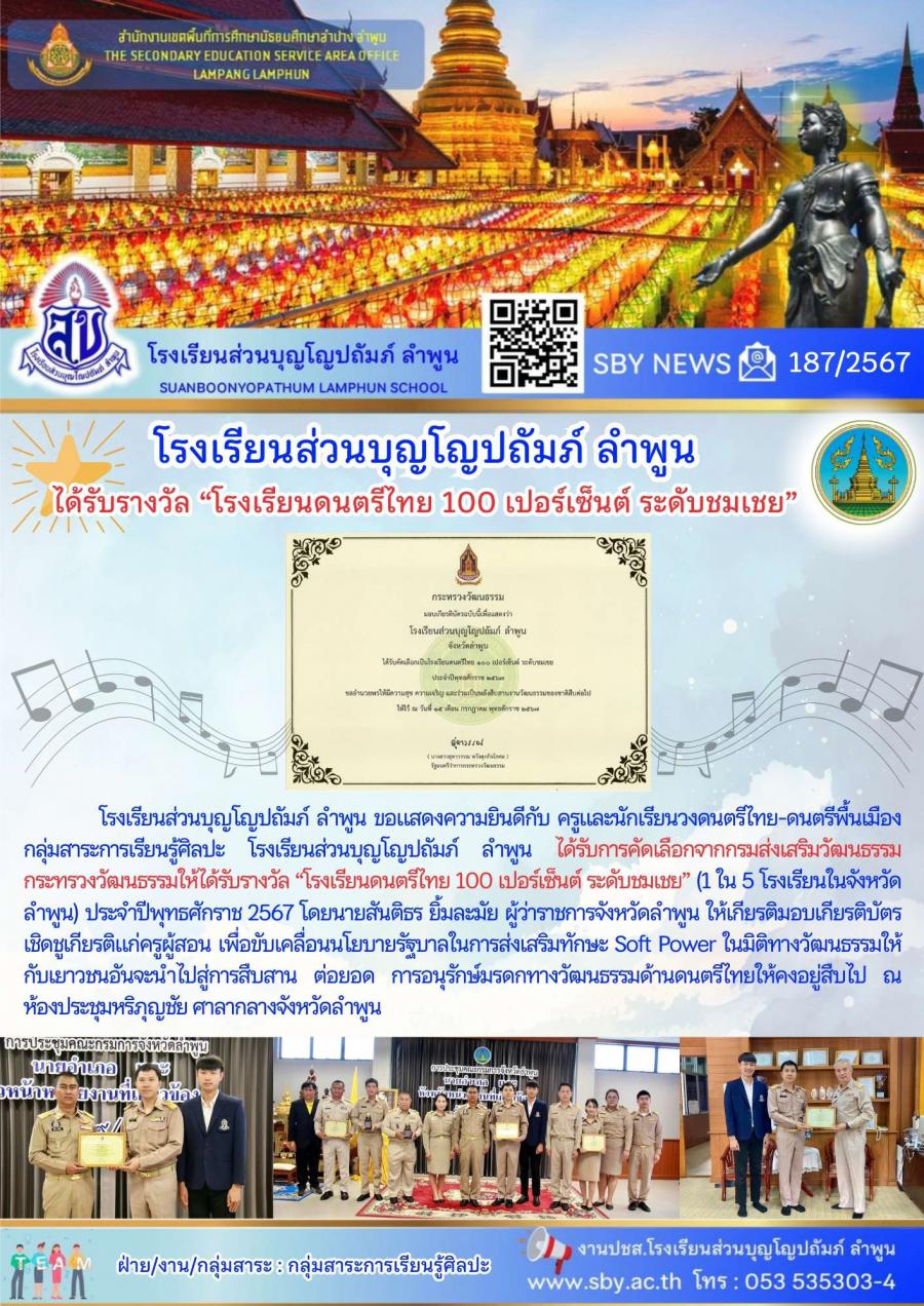 ได้รับรางวัล โรงเรียนดนตรีไทย 100 เปอร์เซนต์ ระดับชมเชย
