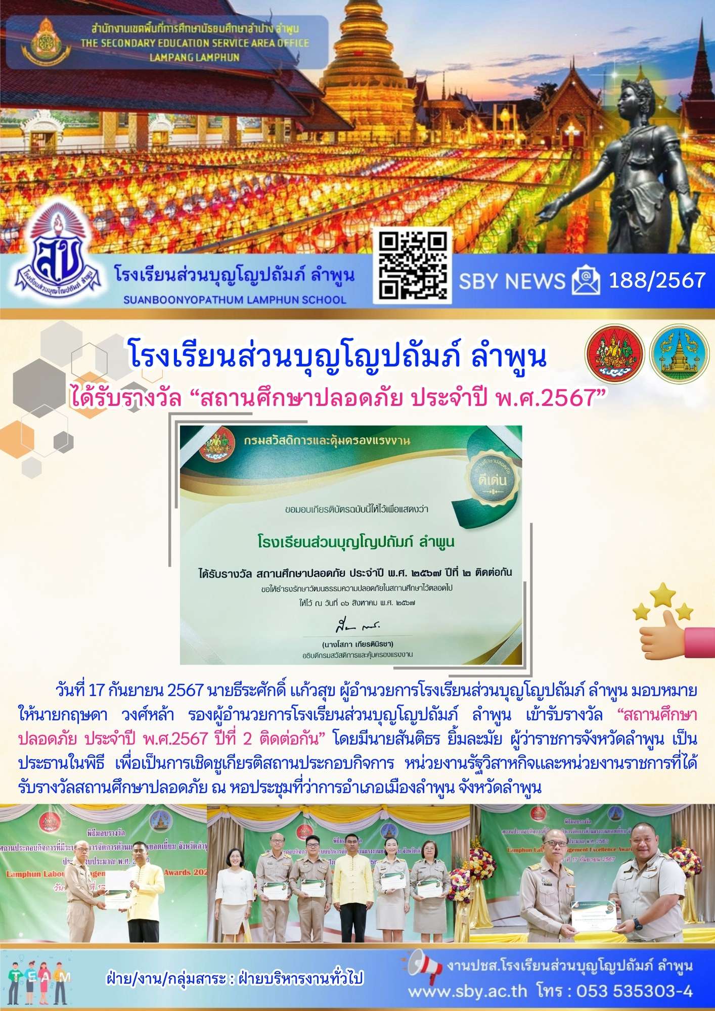 ได้รับรางวัล สถานศึกษาปลอดภัย ประจำปี 2567
