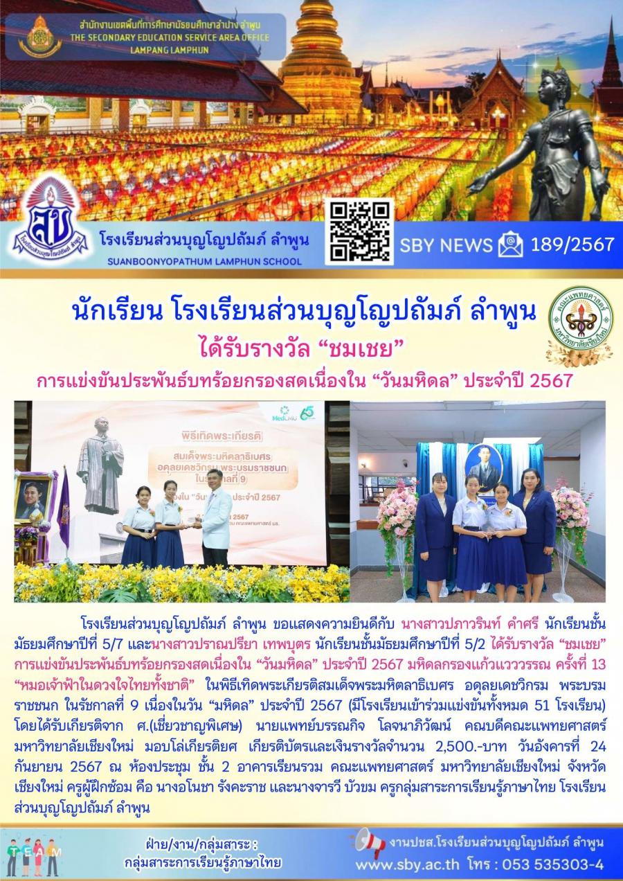 ได้รับรางวัลชมเชย การแข่งขันประพันธ์ บทร้อยกรองสดเนื่องใน วันมหิดล ประจำปี 2567