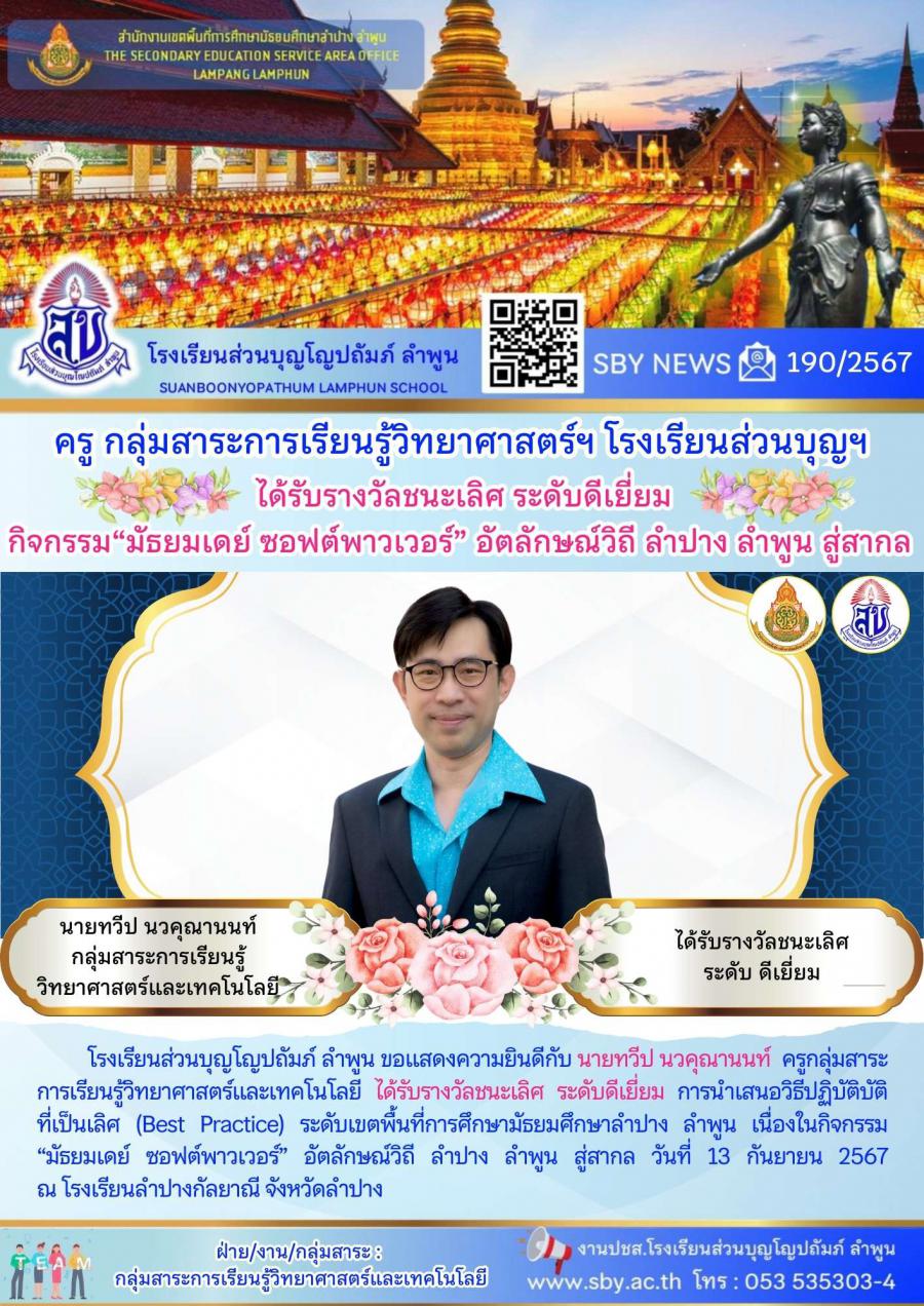 รางวัลชนะเลิศ ระดับดีเยี่ยม ครูทวีป นวคุณานนท์ กิจกรรมมัธยมเดย์ ซอฟต์พาวเวอร์ อัตลักษณ์วิถี ลำปาง ลำพูน สู่สากล