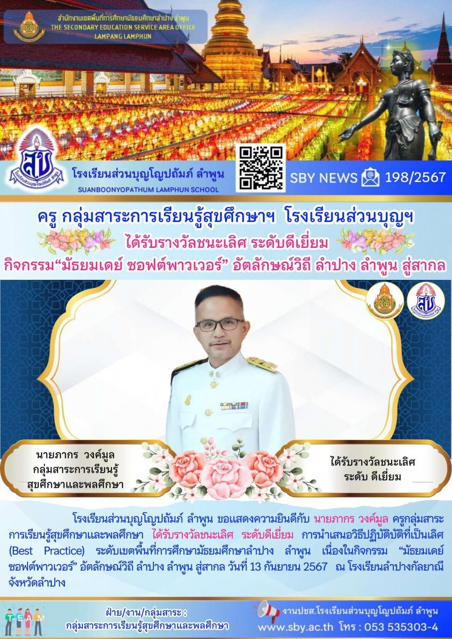 รางวัลชนะเลิศ ระดับดีเยี่ยม ครูภากร วงค์มูล กิจกรรมมัธยมเดย์ ซอฟต์พาวเวอร์ อัตลักษณ์วิถี ลำปาง ลำพูน สู่สากล