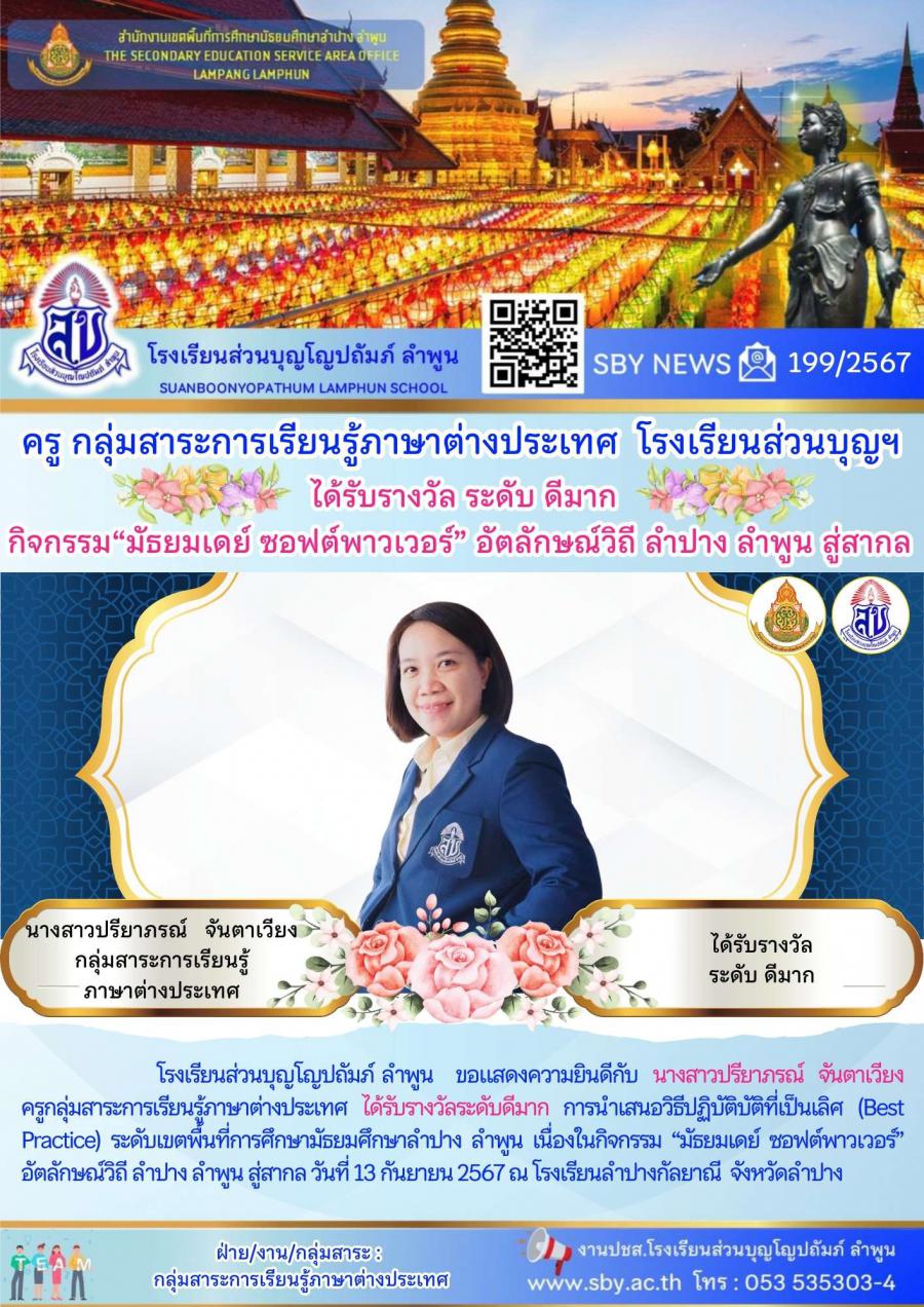 รางวัลระดับดีมาก ครูปรียาภรณ์ จันตาเวียง กิจกรรมมัธยมเดย์ ซอฟต์พาวเวอร์ อัตลักษณ์วิถี ลำปาง ลำพูน สู่สากล