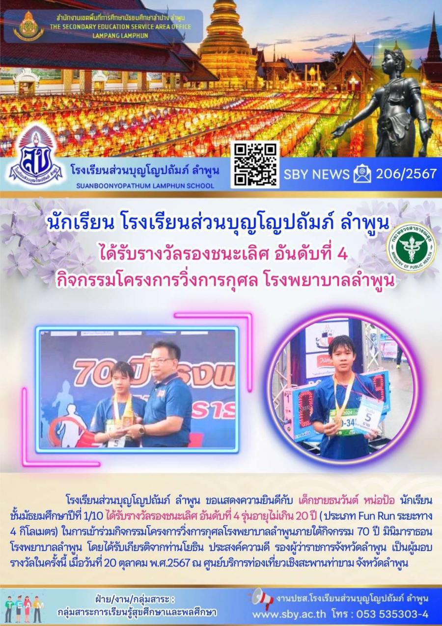 นักเรียนได้รับรางวัลรองชนะเลิศ อันดับที่ 4 กิจกรรมโครงการวิ่งการกุศล โรงพยาบาลลำพูน