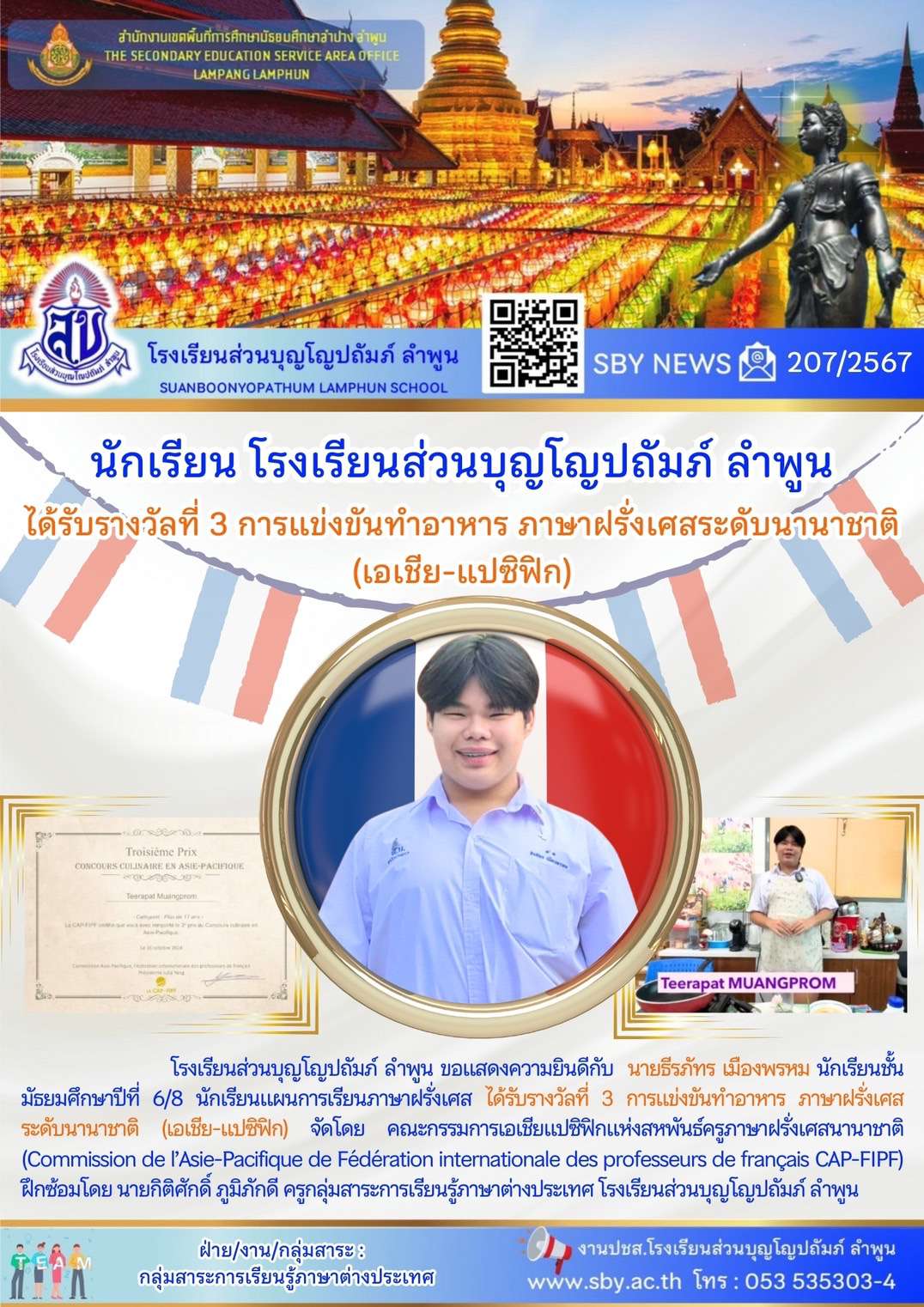 นักเรียนได้รับรางวัลที่ 3 การแข่งขันทำอาหาร ภาษาฝรั่งเศส ระดับนานาชาติ (เอเชีย-แปซิฟิก)
