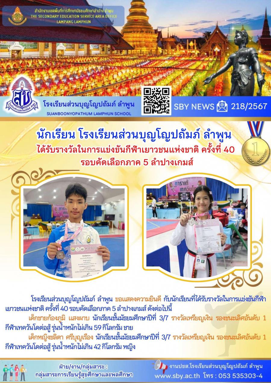 นักเรียนได้รับรางวัล เหรียญเงิน การแข่งขันกีฬาเทควันโดต่อสู้ กีฬาเยาวชนแห่งชาติ ครั้งที่ 40 รอบคัดเลือกภาค 5 ลำปางเกมส์
