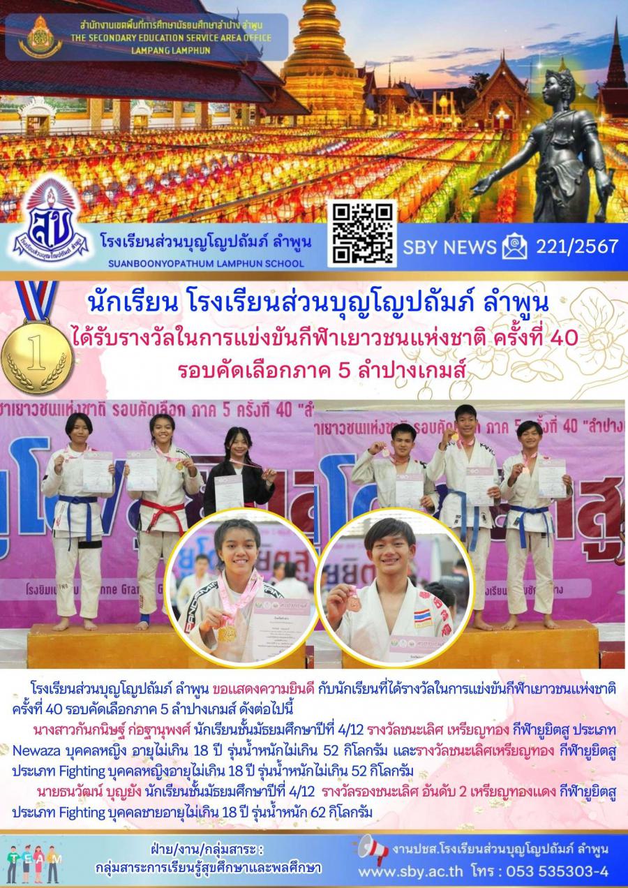 นักเรียนได้รับรางวัลเหรียญทอง และเหรียญทองแดง การแข่งขันกีฬายูยิตสู กีฬาเยาวชนแห่งชาติ ครั้งที่ 40 รอบคัดเลือกภาค 5 ลำปางเกมส์