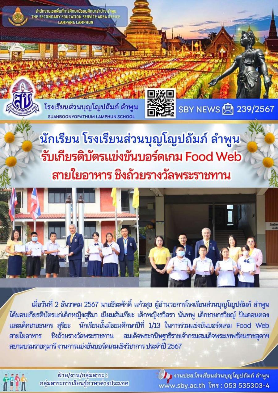 นักเรียนรับเกียรติบัตรแข่งขันบอร์ดเกม Food Web สายใยอาหาร ชิงถ้วยรางวัลพระราชทาน