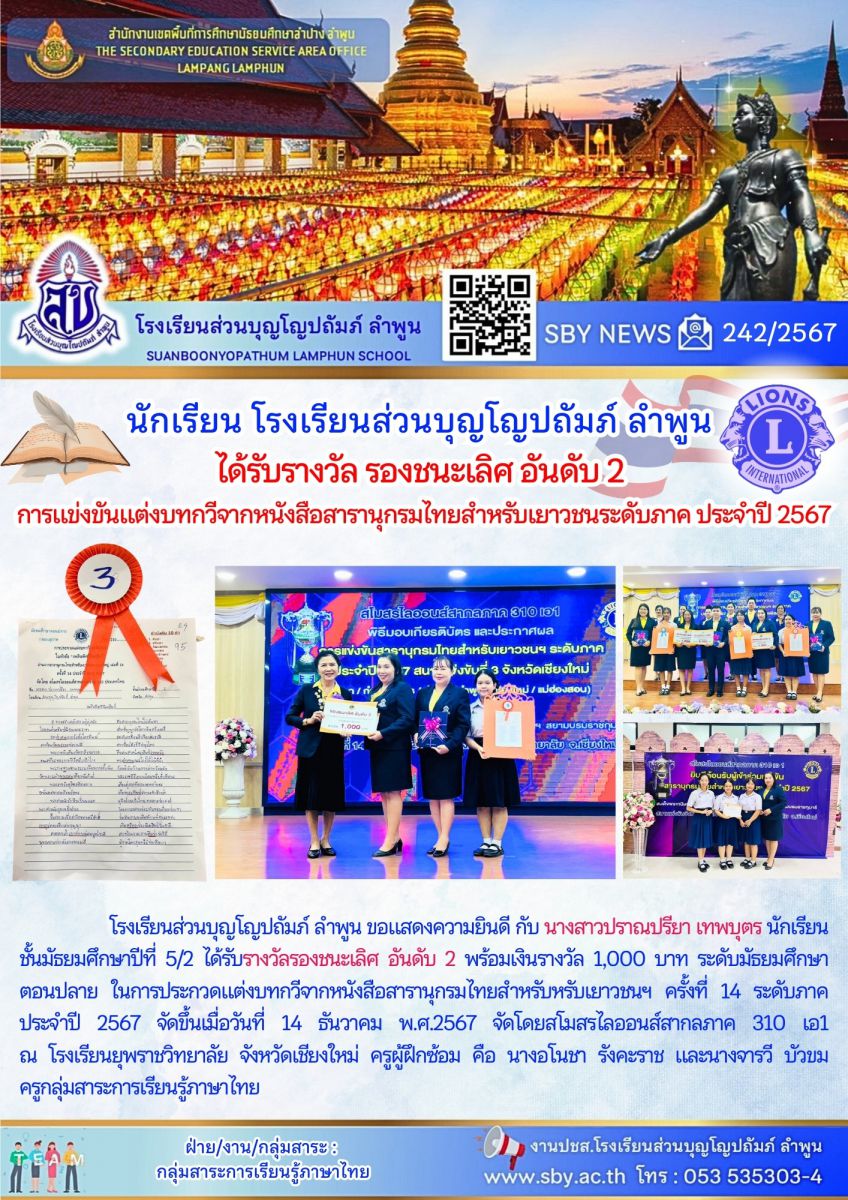 นักเรียนรับรางวัลรองชนะเลิศอันดับ2 การแข่งขันแต่งบทกวีจาก หนังสือสารานุกรมไทย สำหรับเยาวชนระดับภาค ปี2567
