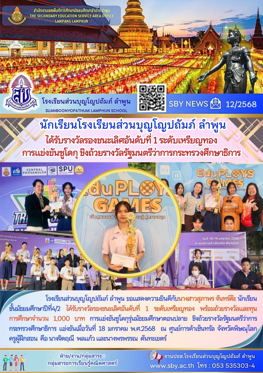 นักเรียนรับรางวัลรองชนะเลิศอันดับที่ 1 ระดับเหรียญทอง การแข่งขันซูโดกุ ชิงถ้วยรางวัลรัฐมนตรีว่าการกระทรวงศึกษาธิการ