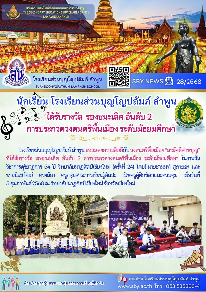 นักเรียนรับรางวัลรองชนะเลิศอันดับสอง การประกวด วงดนตรีพื้นเมือง ระดับมัธยมศึกษา