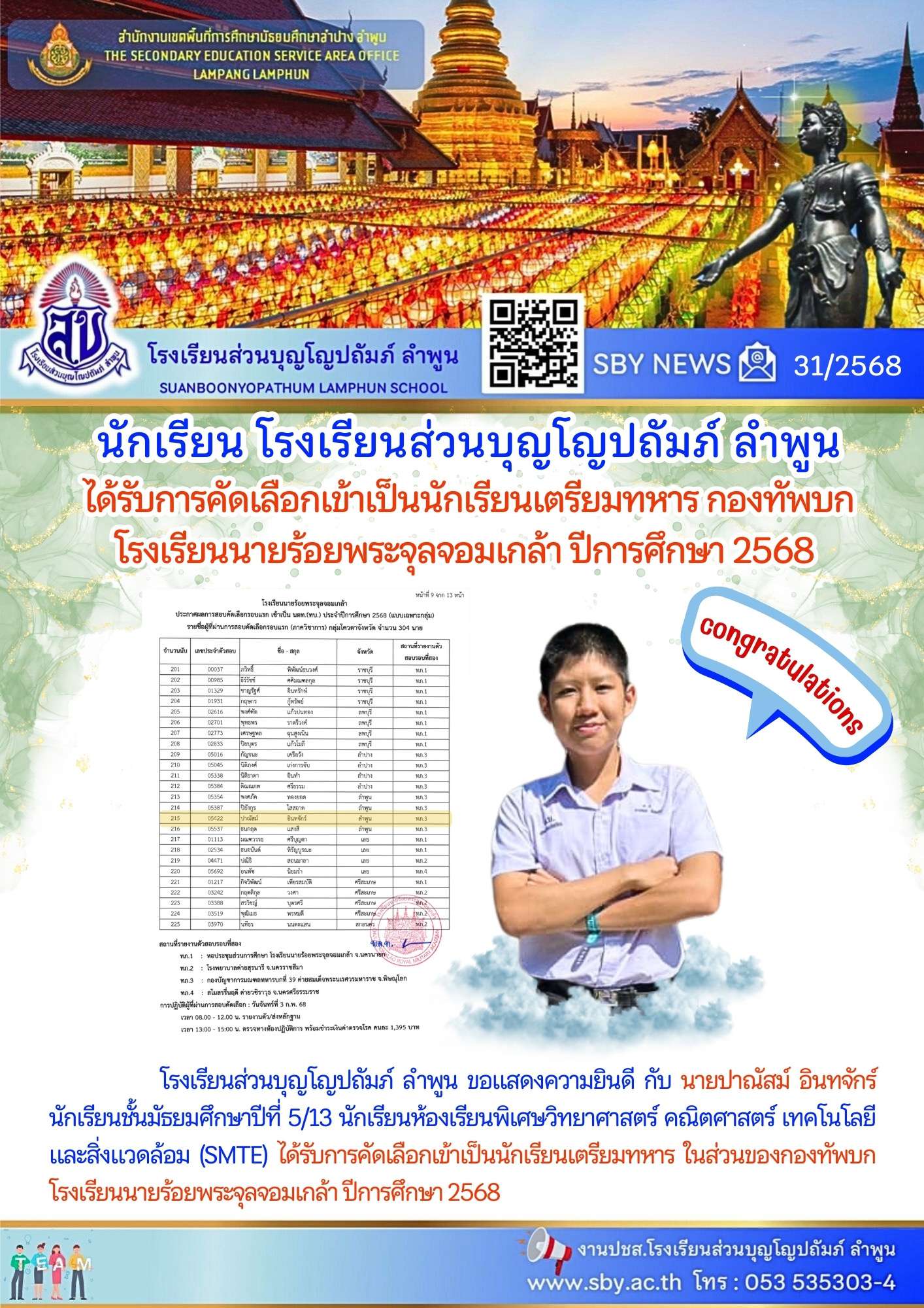 นักเรียนได้รับการคัดเลือกเข้าเป็นนักเรียนเตรียมทหาร กองทัพบก โรงเรียนนายร้อยพระจุลจอมเกล้า ปีการศึกษา 2568