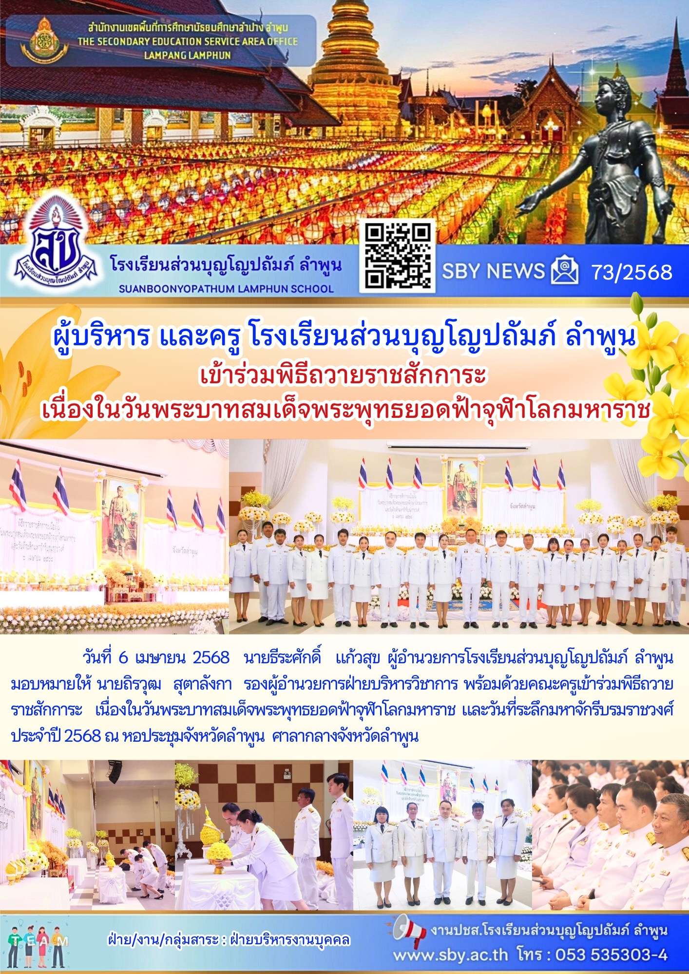 ผู้บริหารและครูเข้าร่วมพิธีถวายราชสักการะเนื่องในวันพระบาทสมเด็จพระพุทธยอดฟ้าจุฬาโลกมหาราช