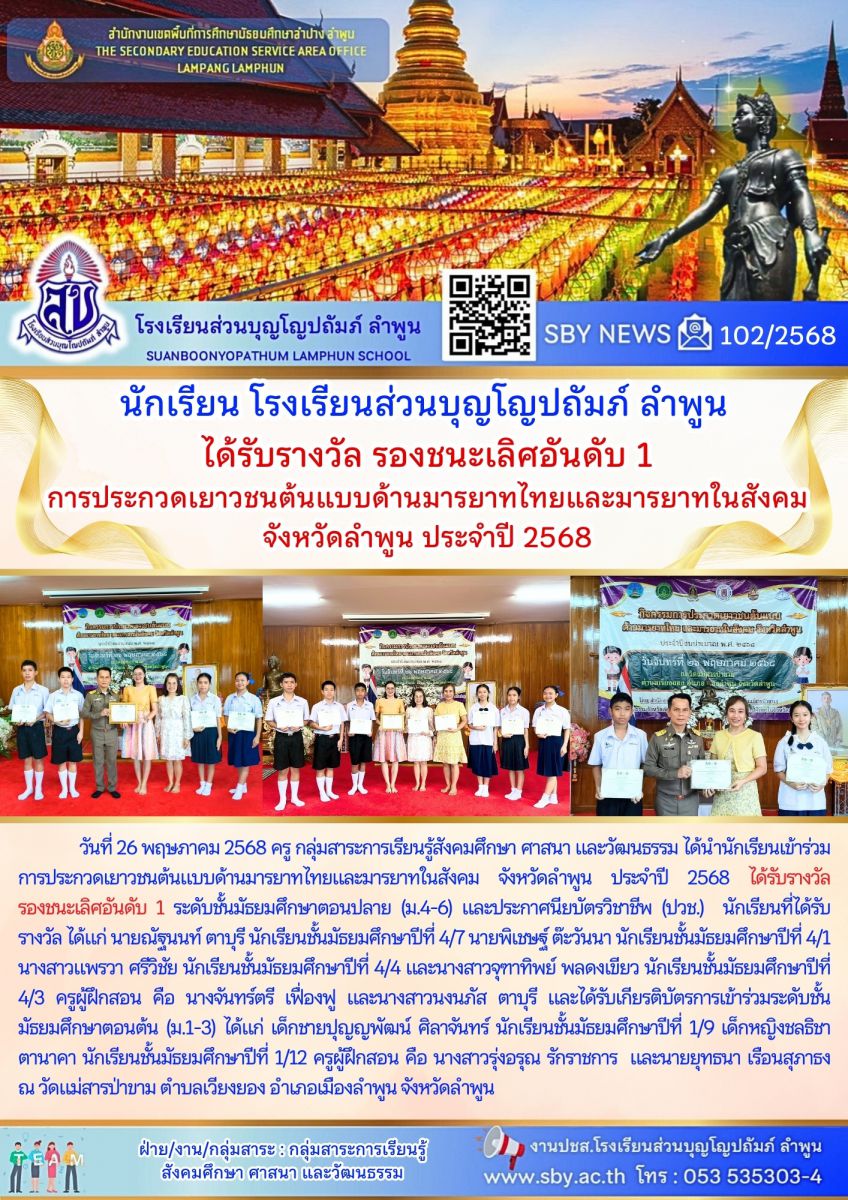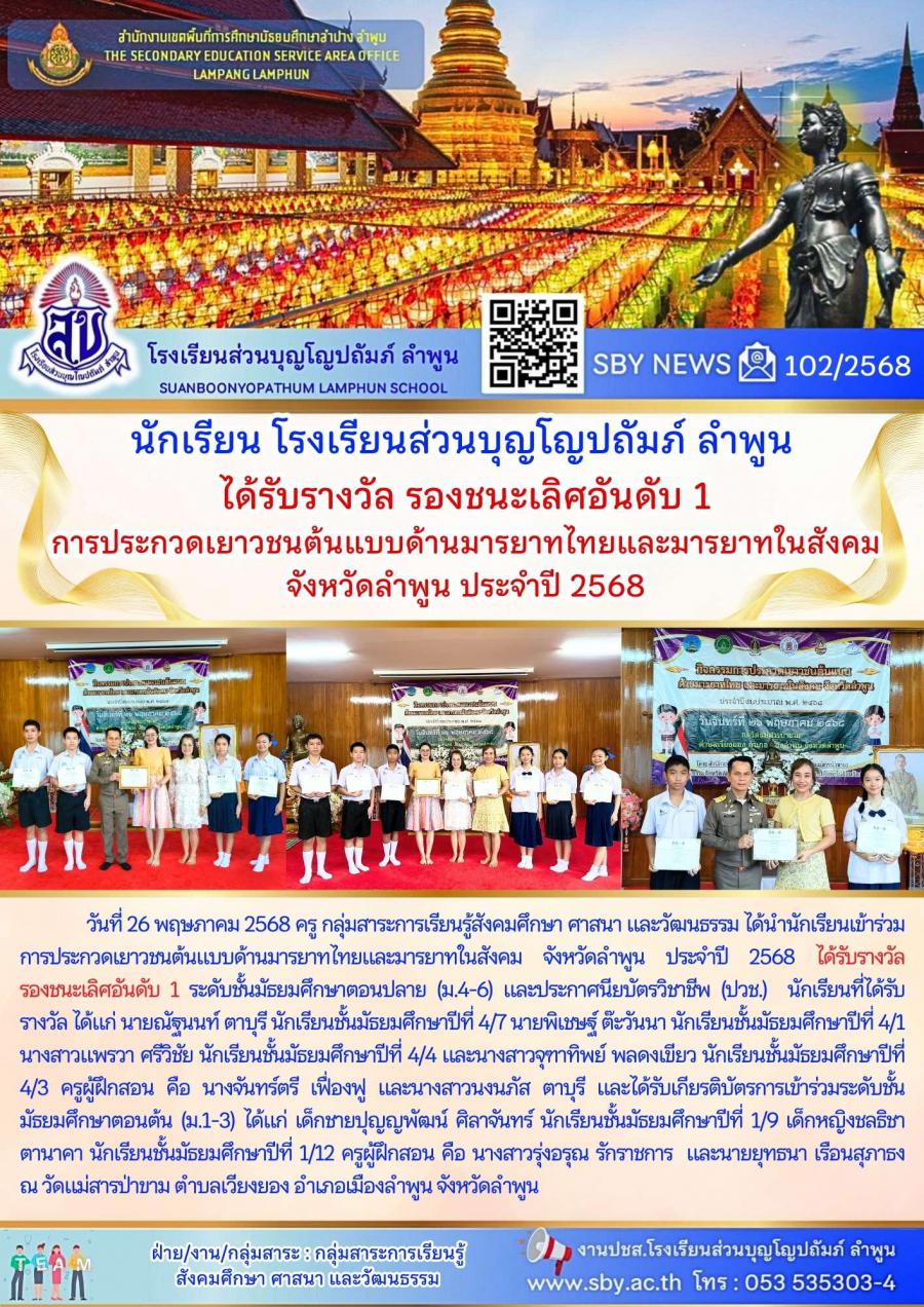 นักเรียนรับรางวัลรองชนะเลิศ อันดับ 1 การประกวดเยาวชนต้นแบบด้านมารยาทไทย และ มารยาทสังคม ปี2568