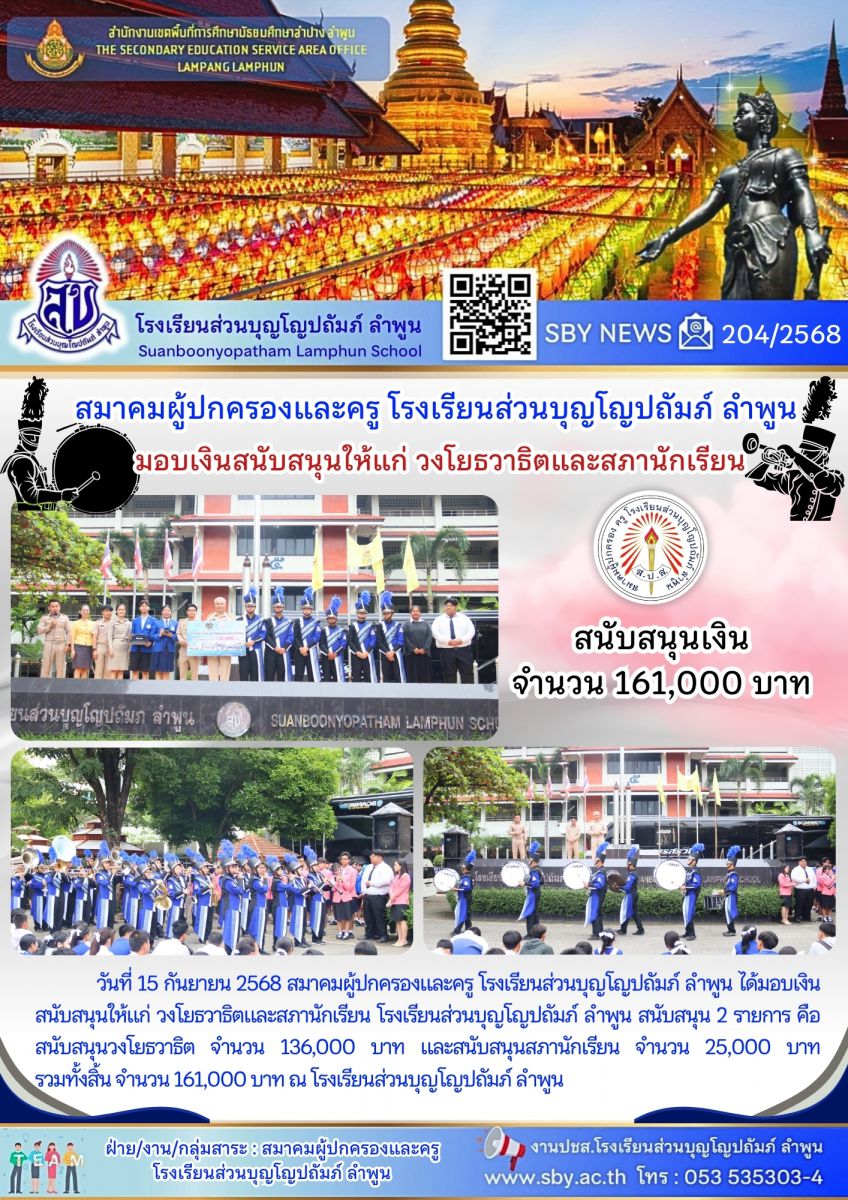 สมาคมผู้ปกครองและครู โรงเรียนส่วนบุญโญปถัมภ์ ลำพูน มอบเงินสนับสนุนให้แก่ วงโยธวาธิตและสภานักเรียน