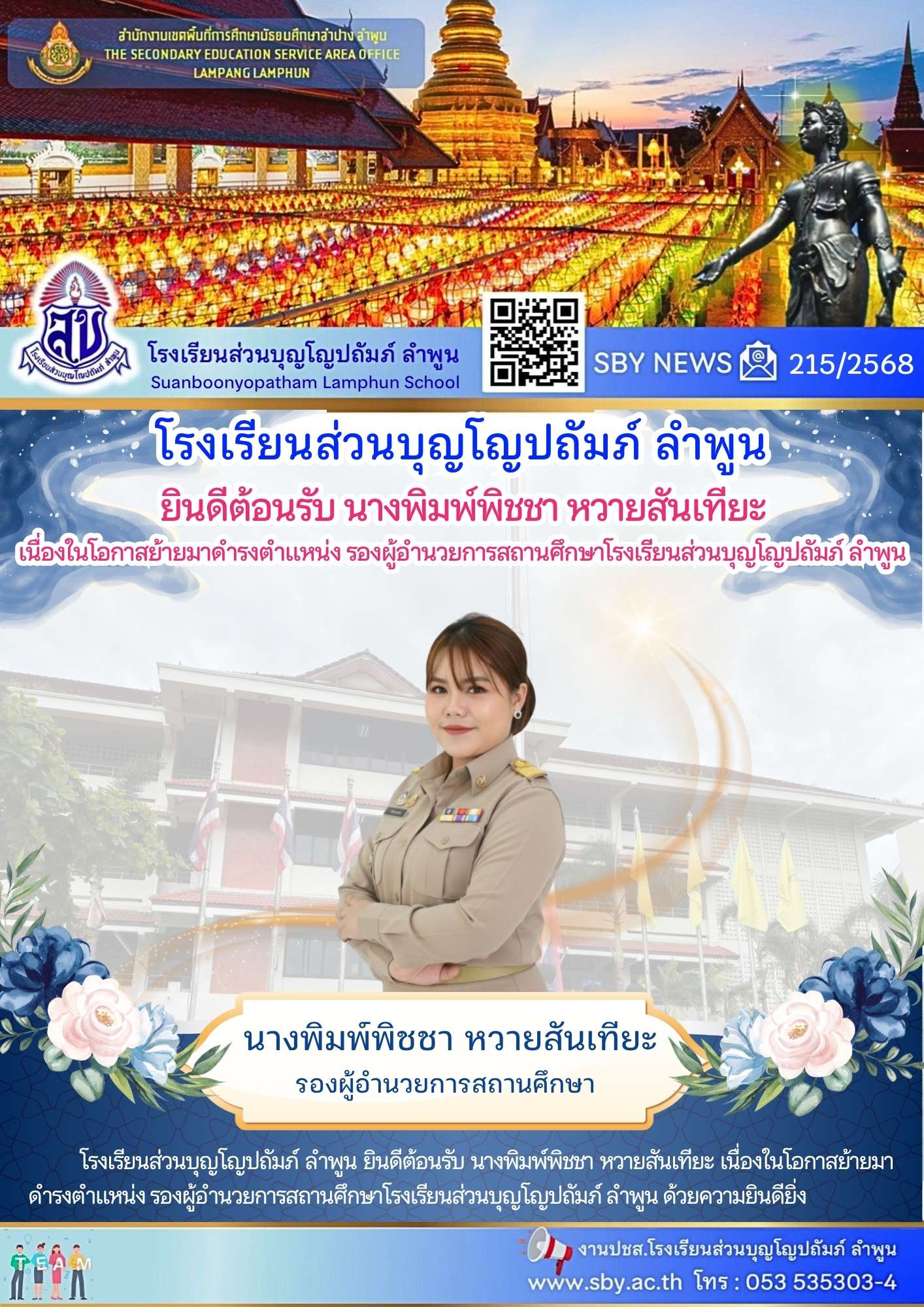 ยินดีต้อนรับ นางพิมพ์พิชชา หวายสันเทียะ เนื่องในโอกาสย้ายมาดำรงตำแหน่ง รองผู้อำนวยการสถานศึกษาโรงเรียนส่วนบุญโญปถัมภ์ ลำพูน