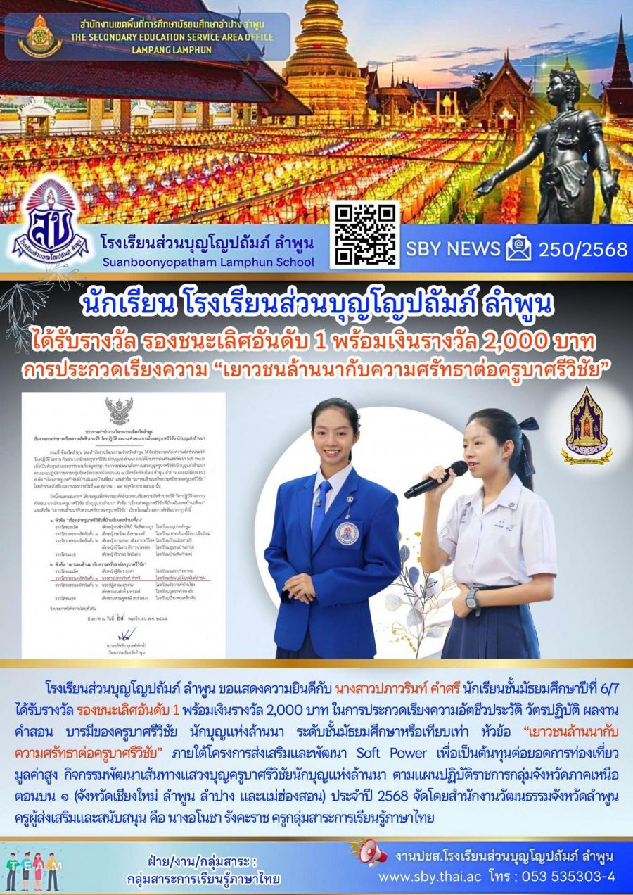 นักเรียนรับรางวัลรองชนะเลิศอันดับ1 การประกวดเรียงความ เยาวชนล้านนากับความศรัทธาต่อครูบาศรีวิชัย