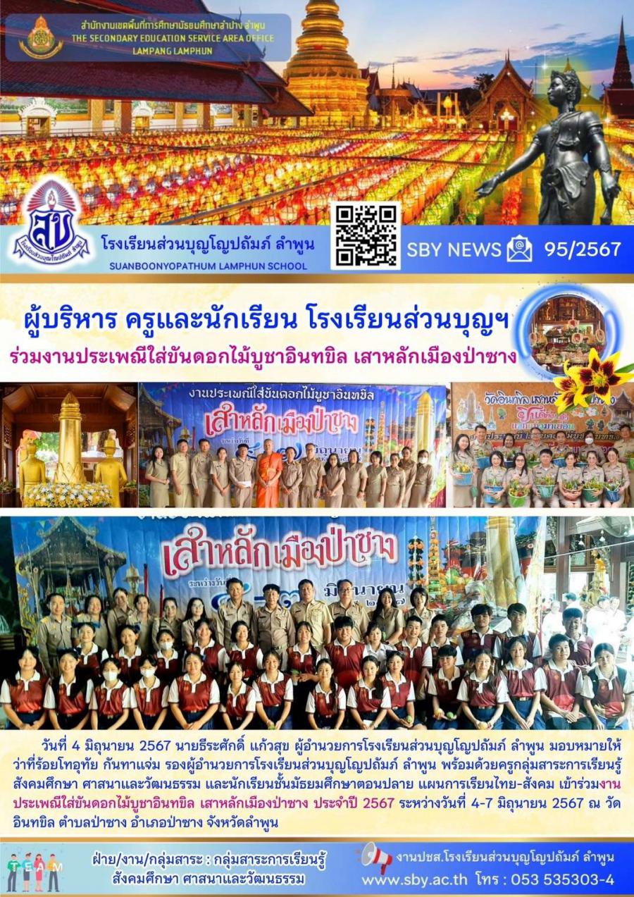ผู้บริหาร คณะครูและนักเรียน โรงเรียนส่วนบุญโญปถัมภ์ ลำพูน ร่วมงานประเพณีใส่ขันดอกไม้บูชาอินทขิล เสาหลักเมืองป่าซาง
