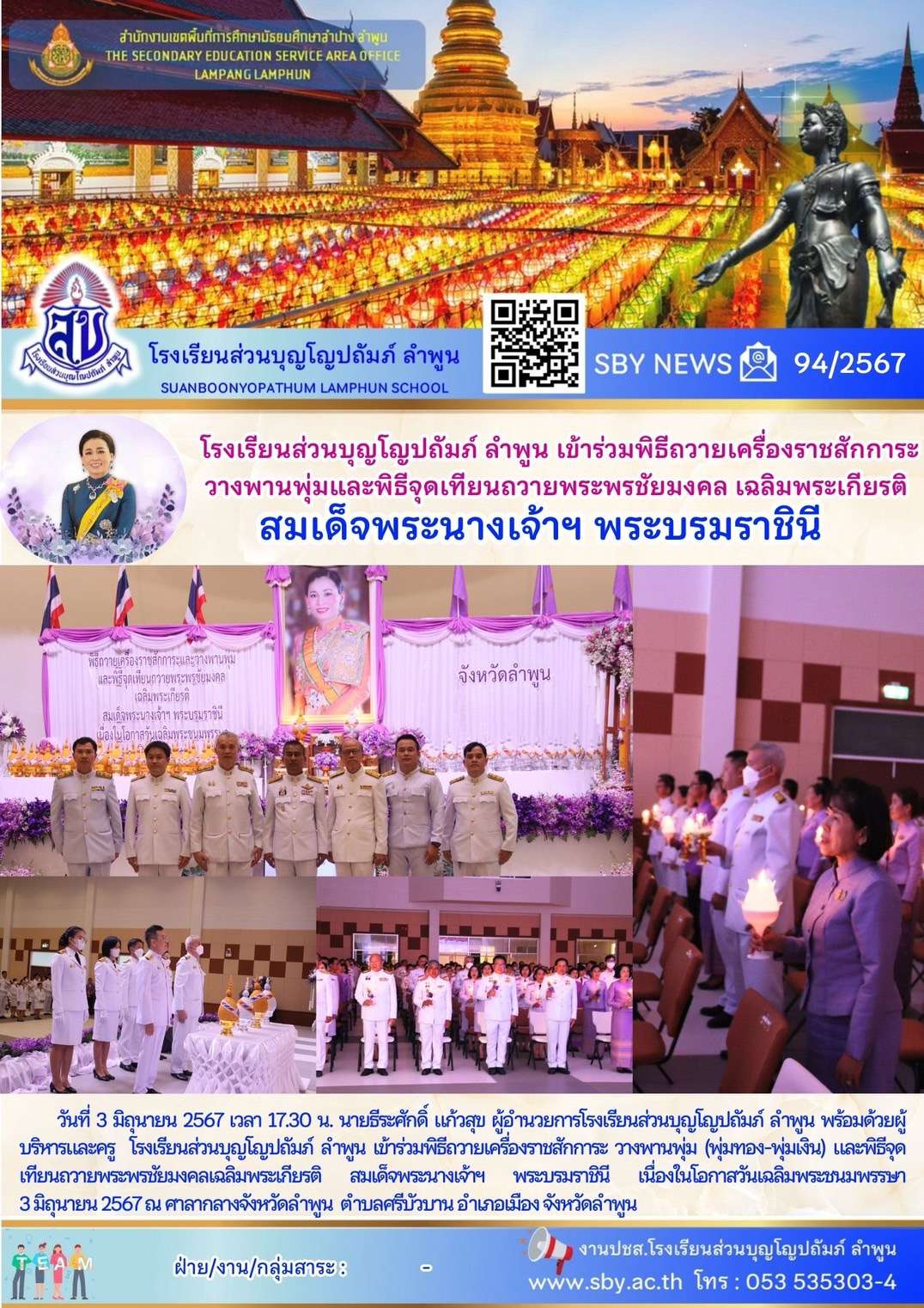 โรงเรียนส่วนบุญโญปถัมภ์ ลำพูน เข้าร่วมพิธีถวายเครื่องราชสักการะวางพานพุ่มและพิธีจุดเทียนถวายพระพรชัยมงคล เฉลิมพระเกียรติ สมเด็จพระนางเจ้าฯ พระบรมราชินี
