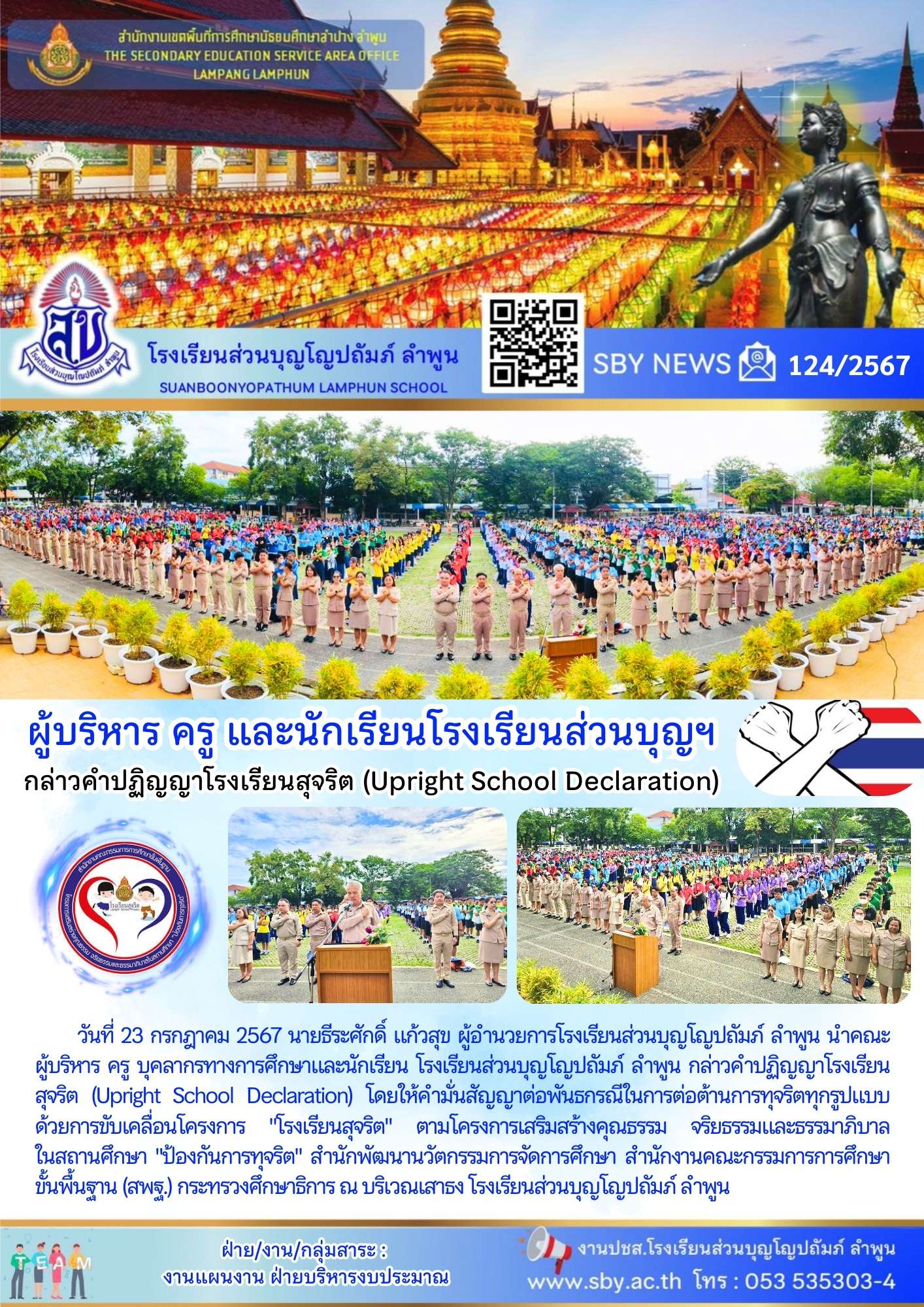 ผู้บริหาร คณะครูบุคลากร และนักเรียน ร่วมกล่าวคำปฏิญญาโรงเรียนสุจริต