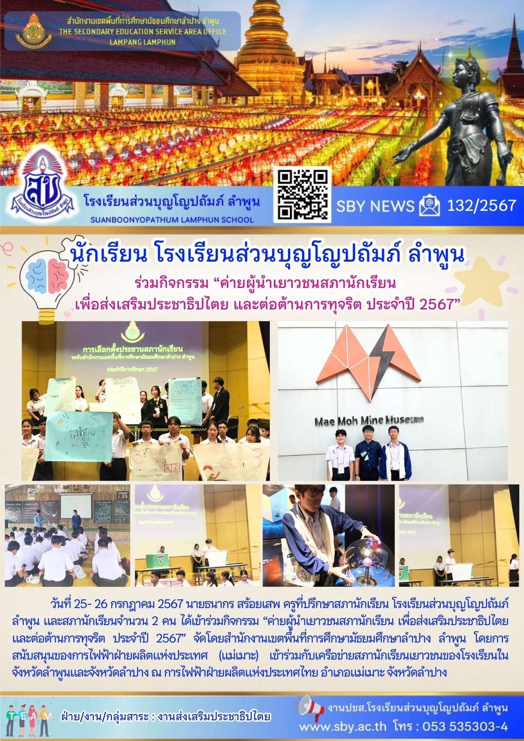 เข้าร่วมกิจกรรม ค่ายผู้นำเยาวชนสภานักเรียนเพื่อส่งเสริมประชาธิปไตย และต่อต้านการทุจริต ประจำปี 2567