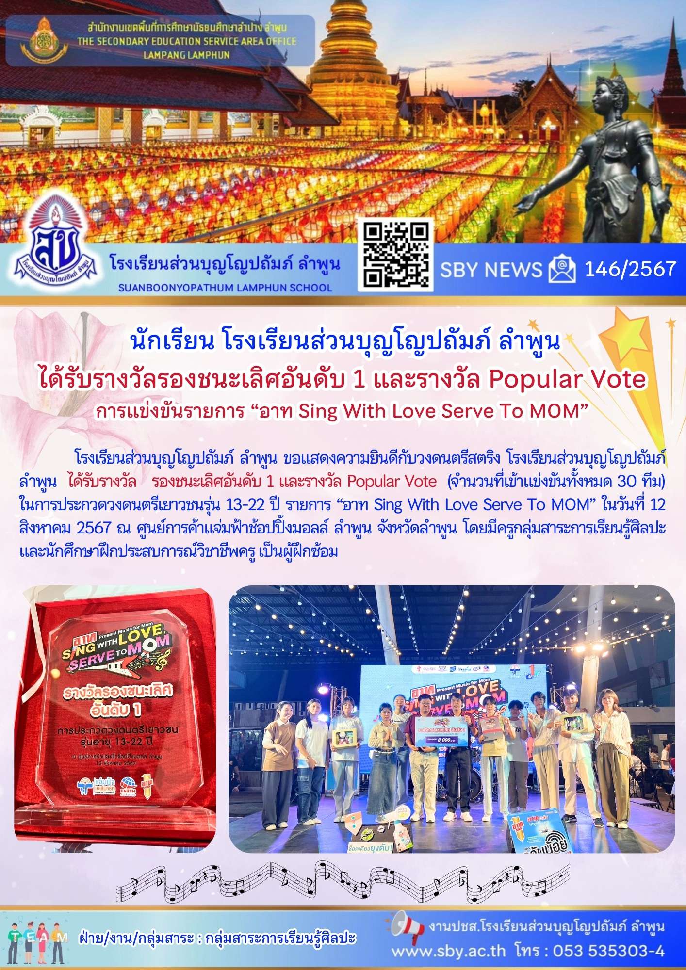 รับรางวัลรองชนะเลิศอันดับ 1 และรางวัล Popular Vote การแข่งขันรายการ อาท Sing With Love Serve To MOM